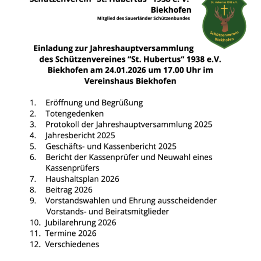 Aktuelles WhatsApp Kanal für alle Infos rund um den Verein! Veröffentlicht 26. Oktober 2024 Lust auf Infos zum Schützenfest und zum Verein? Abonniere den Kanal Schützenverein St. Hubertus 1938 e.V. Biekhofen auf WhatsApp!